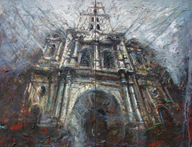 Ahora –siendo más pragmático en el análisis- entiendo la figuración de Payares cercana a un espectro de lo surreal y lo imaginario, eso en un estado plenamente visual. Sus lienzos, cartulinas o cartones, recreados en veladuras y estas hendidas y dibujadas bajo la presión del buril, estampan sociedades arcaicas hiper-tecnologizadas en una especie de retrofuturismo. Sociedades fragmentadas primeramente en su estado material –compuestas de seres cercenados, sin rostro, angulares, edificios truncos, partidos por la mitad o un costado, árboles que escuchan y caminan- y, también, en orden urbanístico –ni calles, ni puertas, ni hendijas, llevan a ningún sitio objetivo-. Pero, si para el surrealismo el “sin sentido” era una herramienta práctica en su (no)significado, para Payares sería el camino más corto a generar el sentido explícito que envuelve cada cuadro. Payares es un pintor de metáforas visuales, de narraciones, sus micro-sociedades traslucen en astutos giros de guión sus verdaderas intenciones. Por eso los silencios primitivos se rompen en torres de telecomunicaciones, o Cuba parte por la mitad a una mujer que habla, o se entrecruzan mensajes en líneas discontinuas, o deambulan sin rumbo antiquísimos seres vegetales: cada obra de Payares es un fragmento cerrado de historia, un capítulo personal devuelto a reflexionar en idioma multitudinario. Descarna los nervios inconexos de la sociedad actual, ahora ensamblada en sus tribus silenciosas e incoherentes, pintadas en los signos y flechas de su cueva de Lascaux posmoderna: como si la imagen, engañosa, necesitara todavía la misma direccionalidad y certeridad de la palabra escrita.